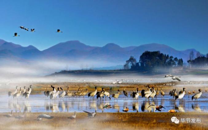 寒冬,腊梅、油茶伴着雪花悄然开放,晶莹剔透的雾凇,将乌蒙高原妆点成银色的世界;成群结队的黑颈鹤一路南下,在威宁草海集结,翩翩起舞……