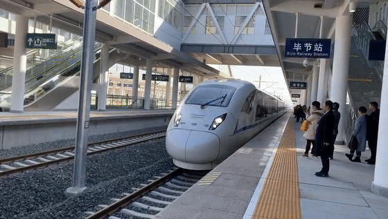 2019年12月16日,一声幽远悦耳的长笛划破冬日长空,成贵高铁“和谐号”动车组载着远道而来的客人,携着无数好奇和惊叹,翻山越岭,穿云跨壑,驶入毕节境内。