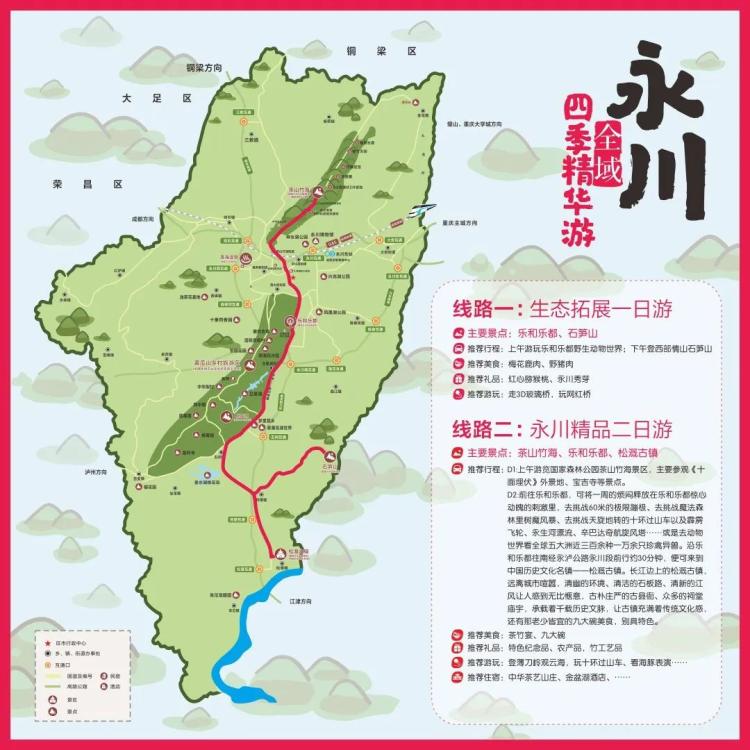 永川旅游资源丰富,拥有茶山竹海、乐和乐都主题公园、黄瓜山乡村旅游区、松溉古镇、石笋山景区、桃花源等一批景区景点。