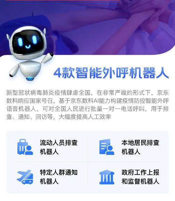 社区防控是打赢疫情防控阻击战的关键环节,技术支撑起到至关重要的作用。京东集团打造的智能外呼机器人、疫情问询机器人、良研问卷等智能工具,全部提供给公共机构,助力社区防疫攻坚战,同样受到工信部的“点赞”。