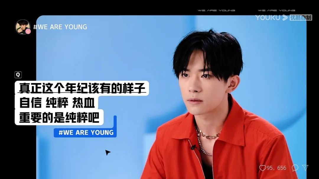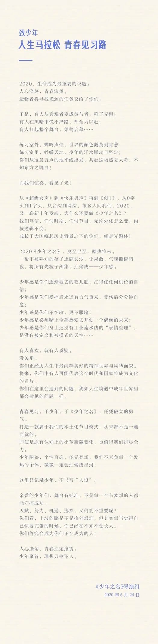“少年感是你们逐渐褪去的婴儿肥,扛得住任何机位的自信;少年感是你们受挫后永远有力气重来,受伤后分分钟自愈;少年感是你们不怕输,更不服输;少年感是必须赌上全部热爱去开创一个偶像的未来;少年感是你们身上还没有工业流水线的‘表情管理’,是没有被定义和被模式的天性……”
