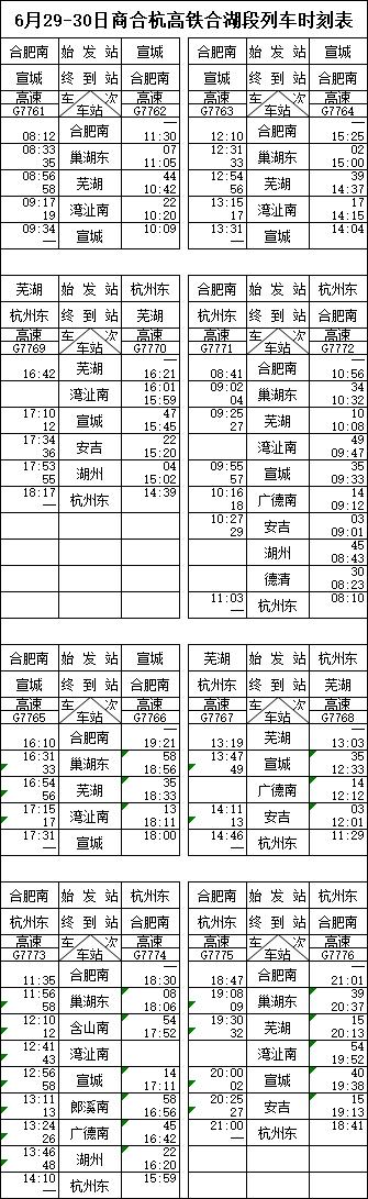 6月28日至6月30日,商合杭高铁合湖段开通运营过渡期内,铁路部门计划安排每日开行列车时刻表如下: