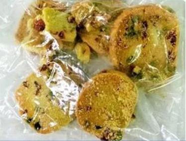犯罪分子将毒品混在烘焙原料中制成曲奇饼干模样,从外表上看与某款饼干无异,里面夹杂着绿色的物质。打开包装袋有异味,含有大麻成分。