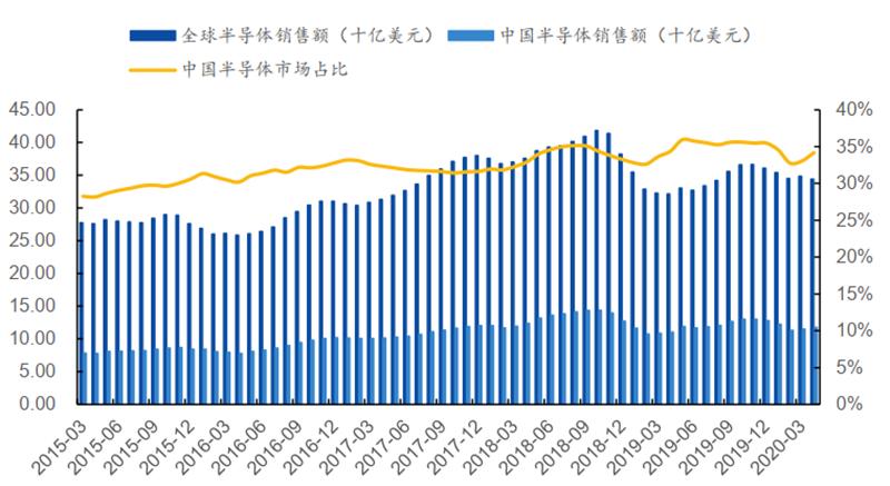 中国半导体市场需求量大,约占全球半导体市场的 1/3。伴随着中国经济的快速发展,在以手机、PC、可穿戴设备为代表的消费电子,以及以物联网、可穿戴设备、云计算、大数据、新能源、医疗、安防等新兴应用领域的快速推动下,国内的半导体市场需求旺盛。美国半导体产业协会数据显示,中国半导体销售额占全球比例约 1/3,已成为球半导体需求市场的重要组成部分。