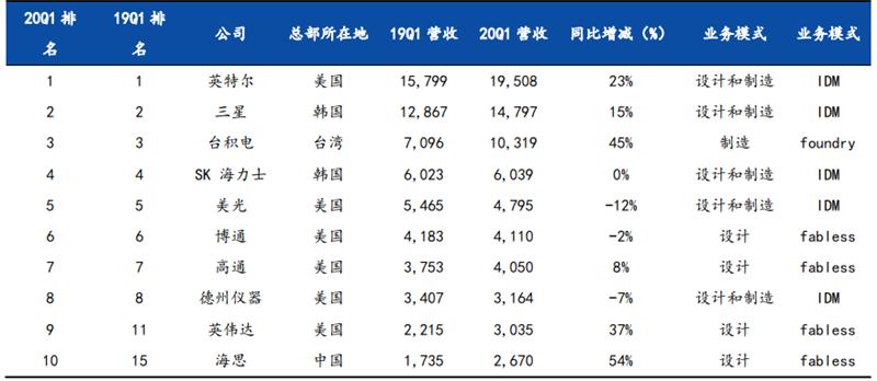 面对中国市场的广大需求,国内企业规模却普遍偏小。根据 IC Insight,2020 年 1 季度十大半导体公司中,绝大多数为美国企业,亦有部分来自于韩国或中国台湾。中国大陆的企业中,仅华为海思的营收规模挤进了前十的行列,且海思在去年同期这一排名仅为 15 名。除海思之外,国内其他半导体企业的规模则处于较小的状态,与中国广大的市场需求不匹配。