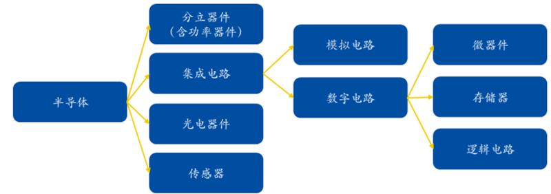 根据不同的下游应用,不同半导体设计公司产品的形态与功能各不相同,因此半导体设计公司可大致按照半导体产品的类型进行分类:分为分立器件、集成电路、光电器件和传感器等,其中集成电路又分为模拟电路和数字电路,其中数字电路包括微器件、存储器和逻辑电路等。
