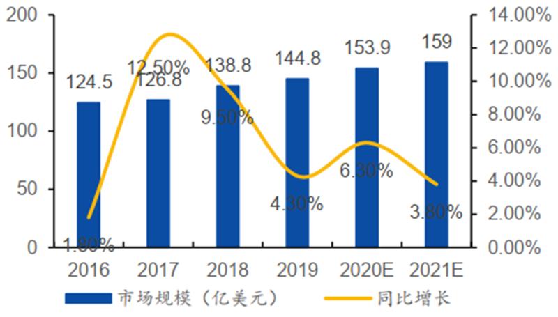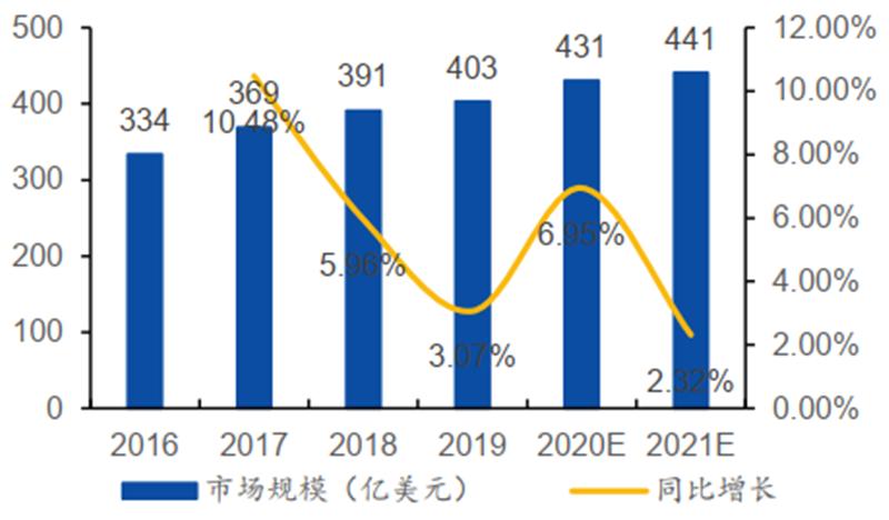 半导体功率器件市场规模高达数百亿美元。根据 IHS 的数据,2019 年全球功率半导体市场规模达到 403 亿美元,同比 2018 年增长 3.3%,预计 2021 年市场规模将达到 441 亿美元。2019 年中国的功率半导体市场占全球功率半导体市场 35.9%的份额,达到 144.8 亿美元,同比 2018 年增长 4.3%,2021 年市场规模有望达到159 亿美元。