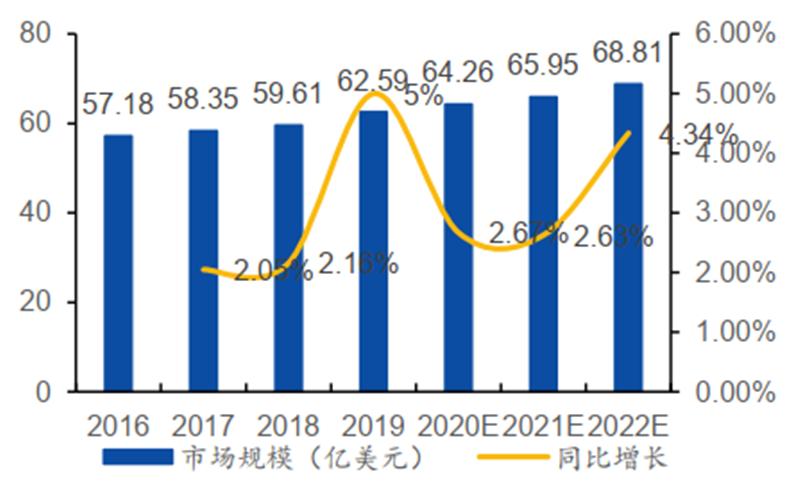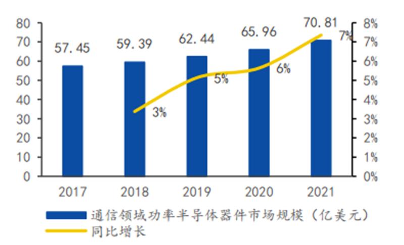 根据中国产业信息研究院的数据,2018 年通讯功率半导体市场规模 59.39 亿美元,预计到 2021 年市场规模将增长近 20%上升到 70.81 亿美元。当前 5G 正处于建设和商用普及的阶段,这将成为通讯功率半导体市场最重要的推动力量。
