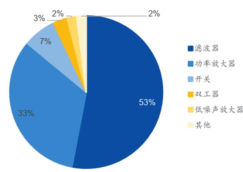 据 Yole 数据估计,射频前端器件中,价值量占比最高的是滤波器,其次是功率放大器,占比分别约为总价值量的 1/2 和 1/3。其余器件包括开关、低噪声放大器等,合计占比约 15%。