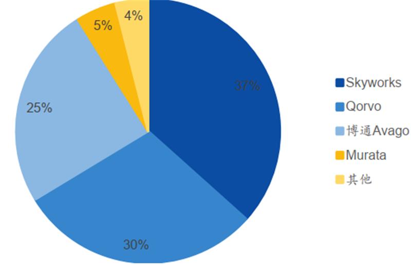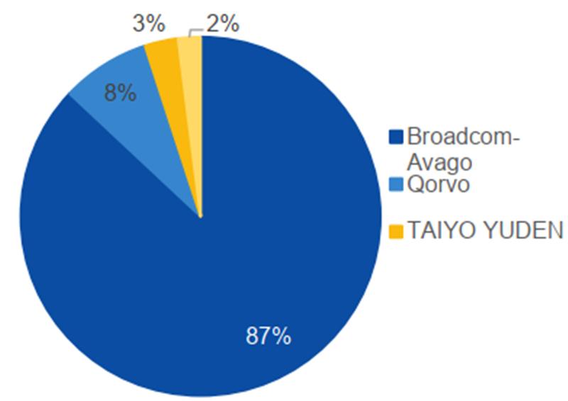 BAW 主要应用于 2.5GHz-6GHz 的高频段。由于 5G 主要采用 2.5GHz 以上的频段,因此 BAW 将在 5G 时代逐渐成为主流的滤波器。BAW 市场由 BroadcomAvago 统治,占据了约87%的份额,其余厂商分别是 Qorvo 和太阳诱电、TDK等;