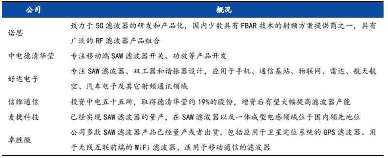 国内企业主要布局 SAW 滤波器,BAW 滤波器涉足的企业较少: