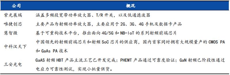 国内 PA 产品大多停留在中低端应用,布局高端应用的 PA 厂商不多。但华为设计的PA 将提高国内厂商布局高端 PA 的信心,目前由华为设计、三安光电代工的砷化镓和氮化镓 PA 进展顺利,有望成为 PA 国产替代的闪光点。其余厂商中,设计公司包括中科汉天下、唯捷创芯、紫光展锐、慧智微、中普微等;代工厂商包括三安光电、海特高新等。