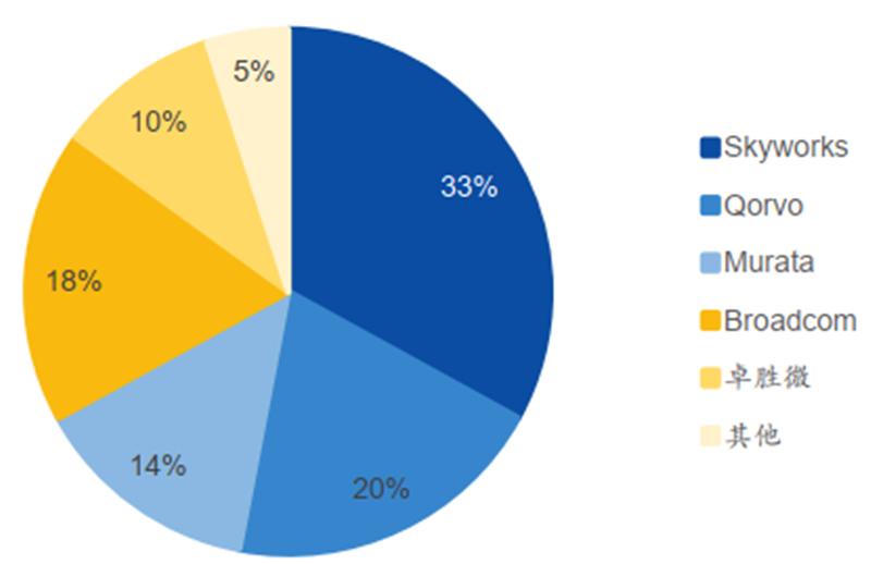 市场格局方面:目前射频开关市场主要被海外公司占据,Skyworks、Qorvo、Broadcom、Murata 合计市场份额超过了 80%。值得一提的是,国内厂商卓胜微占领了 10%左右的市场份额,为全球第五大射频开关龙头企业。