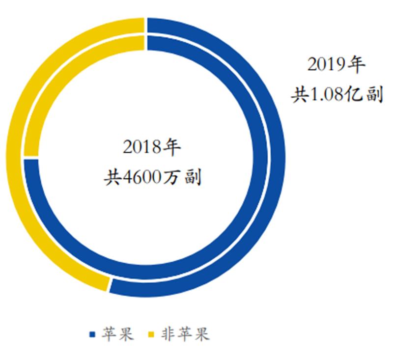 在突破了苹果的相关专利之后,其他厂商逐渐开始跟进,并于 2019 年开始爆发。同时,苹果公司于 2019 年先后推出 AirPods 2 与 AirPods Pro,TWS 耳机市场被彻底引爆。2019 年全年 TWS 耳机销售量突破 1 亿副,相对于 2018 年依然呈现翻番趋势。