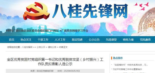 原标题:《来宾十人入选!广西拟表彰一批优秀贫困村党组织第一书记和脱贫攻坚(乡村振兴)工作队员》