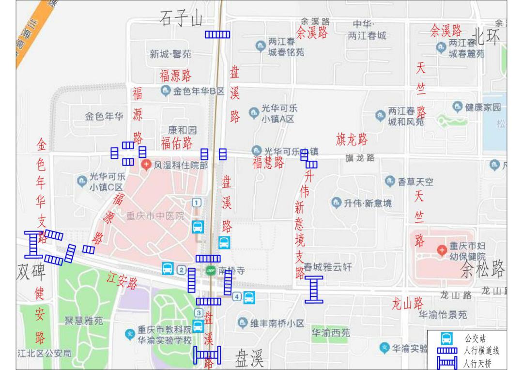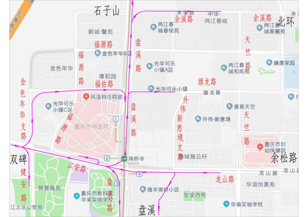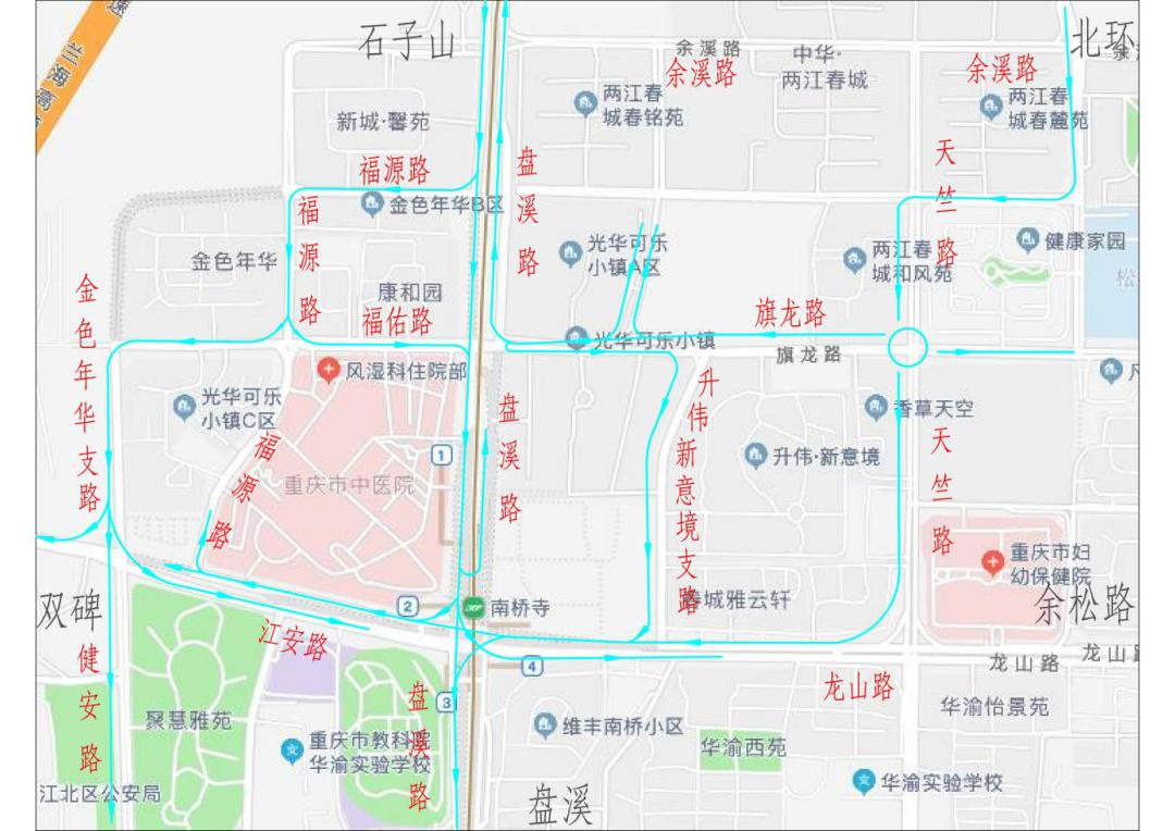 南桥寺立交通车公交车站将进行调整,原市中医院站(永辉侧)、南桥寺站(盘溪至北环方向)2处公交站取消,另行增设5处公交站,以解决周边居民交通出行需要。具体站点见下图: