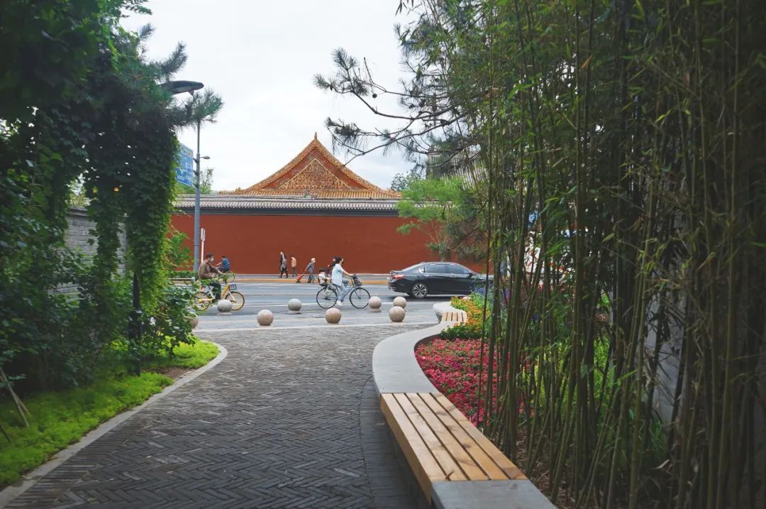 这条街上的几个节点,利用不大的空间建了几个街心公园,其中一个就是在雍和宫旁边,种上了竹子,人们平时可以在长凳上坐着,视线对着雍和宫正殿山墙。