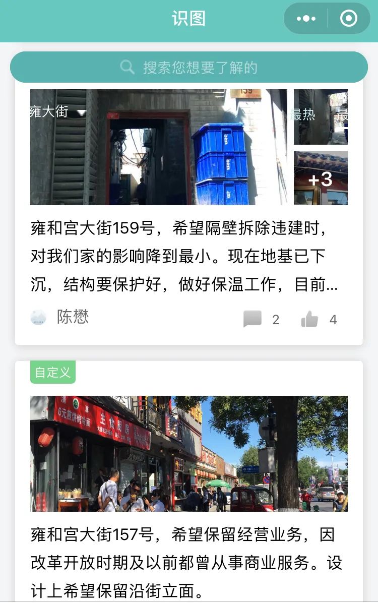 我们信息中心的同事做了小程序,让居民可以在上面评议,家门口哪些地方设施不完善,哪些地方脏乱差,然后做一些工作坊,收集意见。有时候当地老人对于胡同改造说出来的看法,比我们从学术角度提的意见更好。