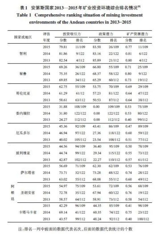 表 1 安第斯国家2013—2015年矿业投资环境综合排名情况