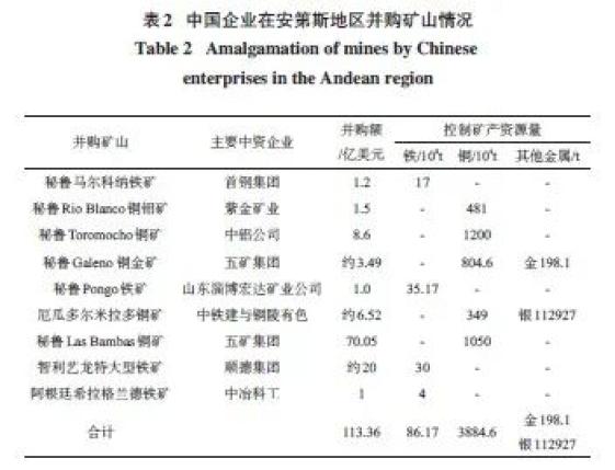 自改革开放以来,安第斯地区以其优越的矿产资源条件和较良好的矿业投资环境,成为中国企业在海外进行矿业投资的热点地区。自1992年首钢集团投资购买了秘鲁铁矿以来,经过20多年的发展,中国企业在安第斯国家的矿业投资已初具规模。据不完全统计,截止到2014年底,在安第斯各国投资矿业(含地质勘查)的中国大型国有企业就有6家,还有一些大型的民营企业(如紫金矿业、庄胜集团、金兆集团、顺德集团等)和众多的中小型企业、地勘单位。矿业投资总额达200多亿美元。矿业投资方式多种多样,既有大规模的企业并购,也有合资参股和与当地居民或公司合作的项目, 以及直接登记矿权进行的草根勘查。其中,矿山企业并购是中国企业在安第斯地区最主要的矿业投资形式。据不完全统计,中国企业在安第斯地区的矿山并购投资(直接购买费用,不包括后期的矿山建设和生产改造投资)已达113.36亿美元,若加上矿山建设和生产改造投资,估计将超过300亿美元。控制的矿山铜资源量达3884.6×104t,铁86.17×104t。其中五矿集团公司联合国新国际投资有限公司、中信金属有限公司以70.05亿美元从嘉能可斯特拉塔(Glencorexstrata)公司购买的秘鲁Las Bambas铜矿,成为当年全球最大的金属矿山并购项目,也是中国金属矿业史上迄今实施的最大的境外并购(表 2)。目前这些并购矿山有的已经投产,并取得了效益。