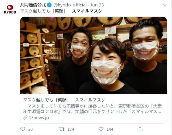 ●近日,日本多地出现各式各样的“笑脸口罩”,有大笑版、微笑版,甚至还有红唇版。据称,这种口罩是由普通口罩加覆膜处理过的笑脸打印纸组合在一起而成。有民众表示,在疫情期间不得不佩戴口罩的情况下,有了这些“笑脸口罩”,可以在防疫的同时将微笑带给众人,非常实用。(来源:中新网)