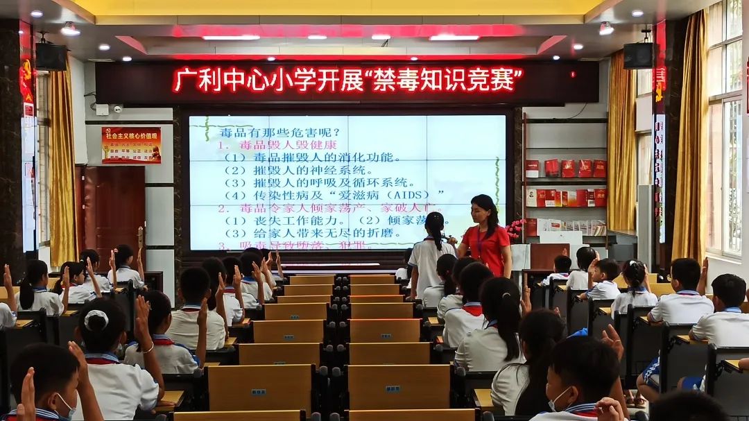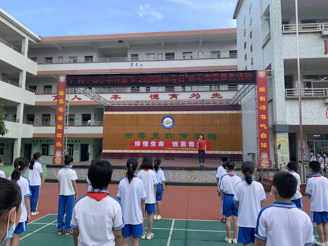 2020年6月22日,在广利中心小学的操场上弥漫着浓厚的禁毒气氛,方玉明正在主持一场以“拒绝毒品,共建无毒校园的”为主题的禁毒宣讲会,“青少年往往是因为好奇、赶时尚、被诱导交友不当等原因而沾染毒品……”她图文并茂、生动形象地向大家阐述着毒品的危害以及如何辨别毒品。在活动现场,志愿者老师们还为学生设置了禁毒趣味游戏板块,分成“祛”毒健身抖、“身受其害”、“慧眼识毒”及“穿越毒区”四项游戏,吸引了全校学生的踊跃参与。