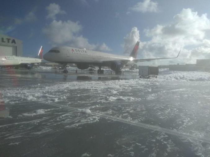 在下面的视频中,可以看到大量的阻燃泡沫从上喷洒在飞机上。没有人员受伤的报告。