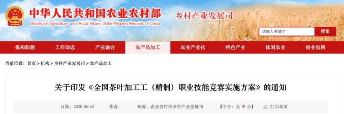 根据《农业农村部 人力资源社会保障部 中华全国总工会关于举办2020年第三届全国农业行业职业技能大赛的通知》(农人发〔2020〕3号)要求,我部组织全国茶叶加工工(精制)职业技能竞赛。现将《全国茶叶加工工(精制)职业技能竞赛实施方案》印发你们,请结合实际精心组织、认真落实。