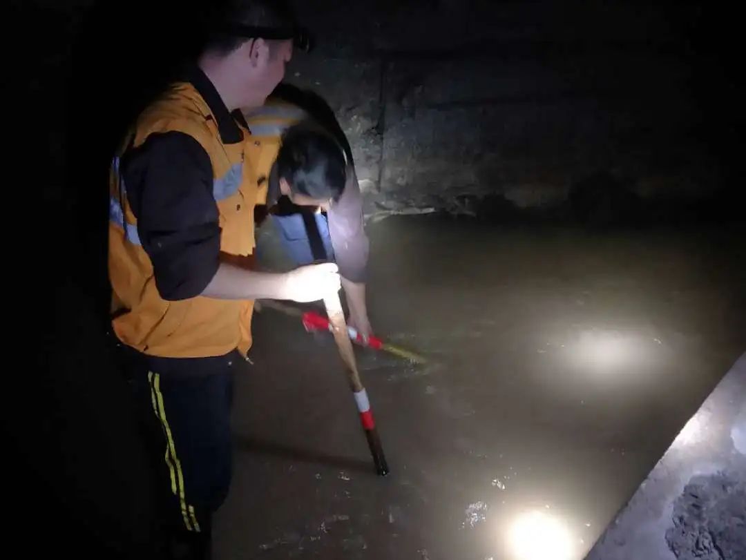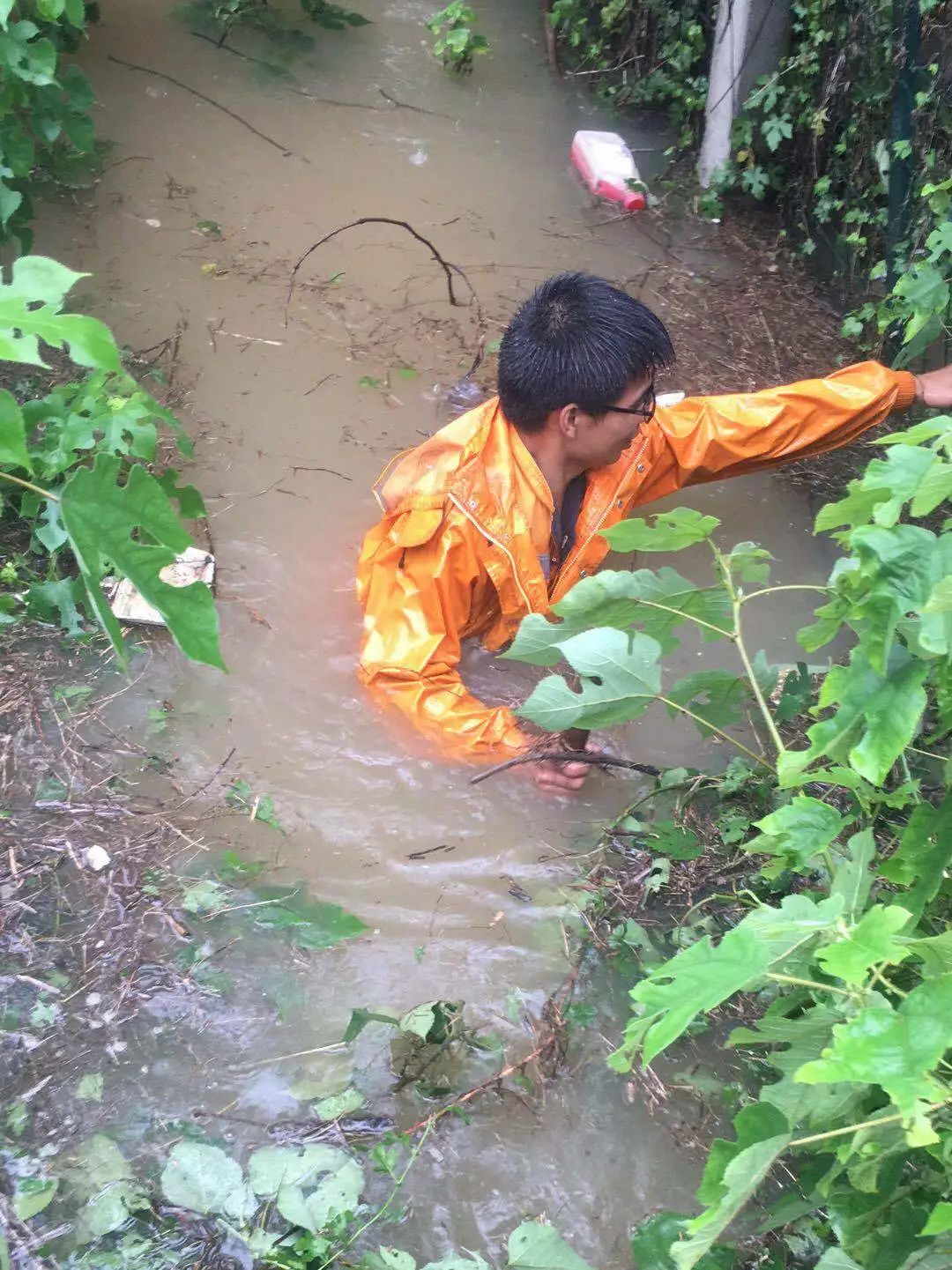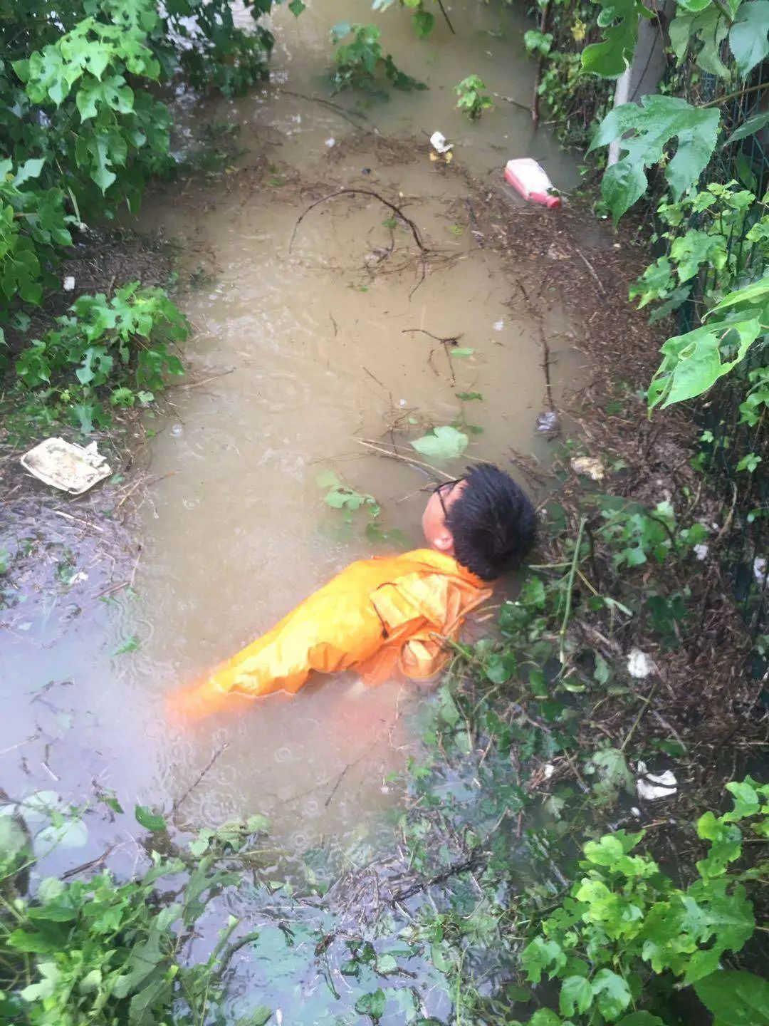 钟祥线路车间东桥维修工区干鹏飞跳入积水1米多深的侧沟清淤,污浊的雨水淹至他的脖子。