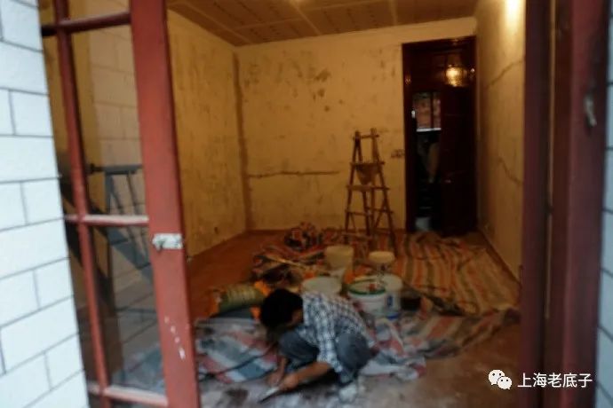 下图是与巴金故居相邻的56号,这是新中国首任上海市副市长、爱国人士盛丕华故居。笔者走入此楼一层拍摄的图片(工人正在装修),可见这单开间的客厅不大,而小院的一半(下图左侧)因为被业主自行搭建出一带淋浴功能的小间,进门时更显拥挤,客厅也因此显得有些昏暗。