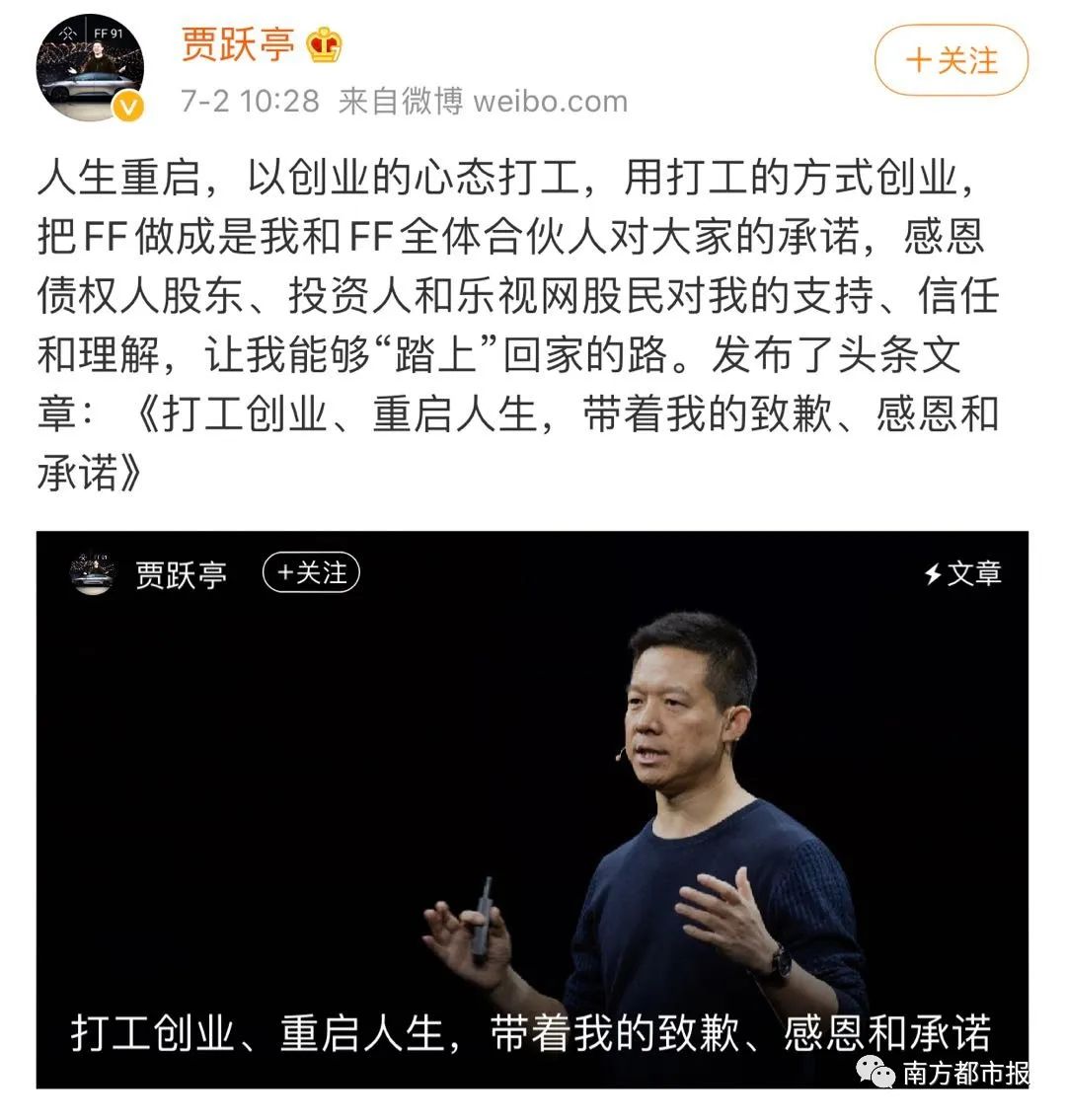 今天上午,贾跃亭发布标题为《打工创业、重启人生,带着我的致歉、感恩和承诺》的致歉信。