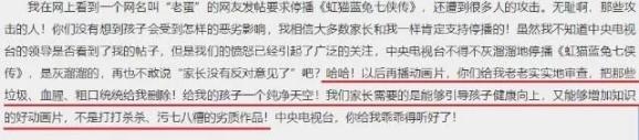 以后再播动画片,你们给我老老实实地审查,把那些垃圾、血腥、粗口统统给我删除!给我的孩子一个纯净天空!