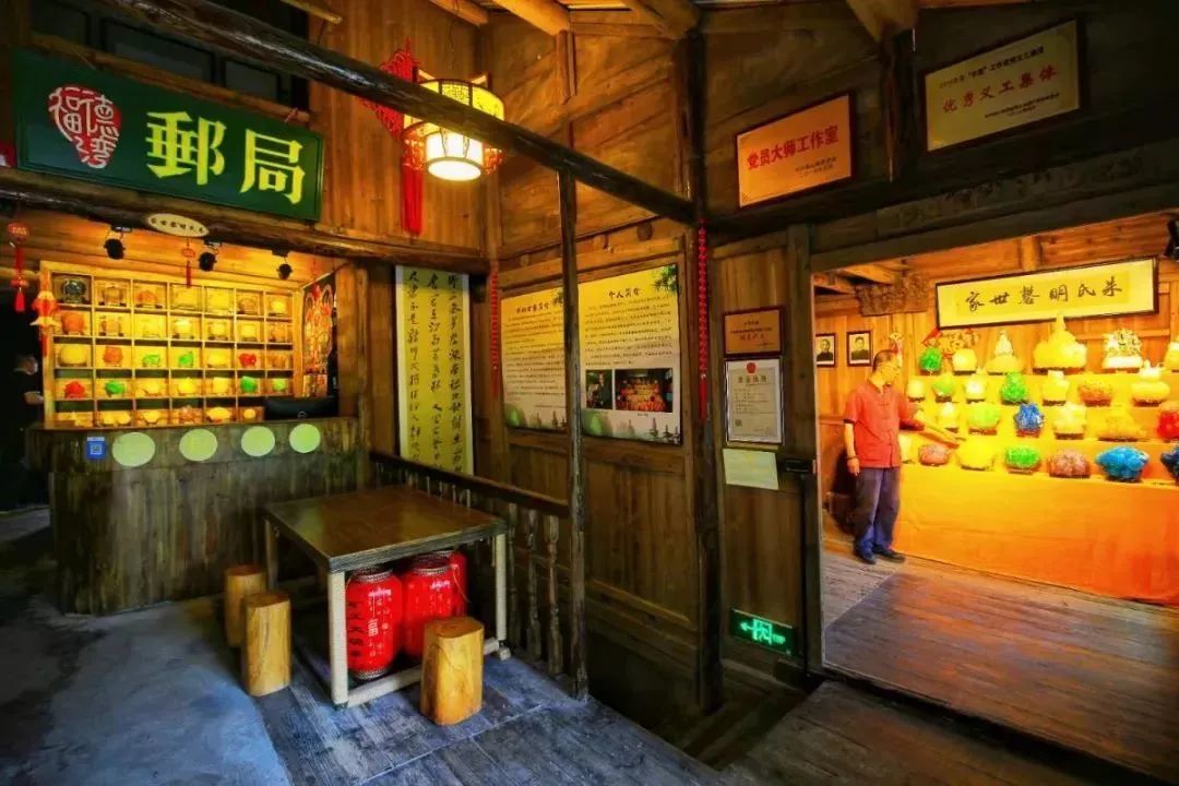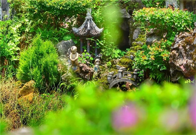 喜欢微缩景观的人也不可错过在“汪田小筑”一饱眼福的机会。这是一位叫朱善贤的老人创造的一片微缩天地。错落有致的假山、寺庙、生意盎然的假草,一比一复刻的现实世界,在这位老人手上熠熠生辉。屋内还陈列着令人称奇的矾塑,墙上挂着矾塑工艺的流程让大家了解这项传统技艺。
