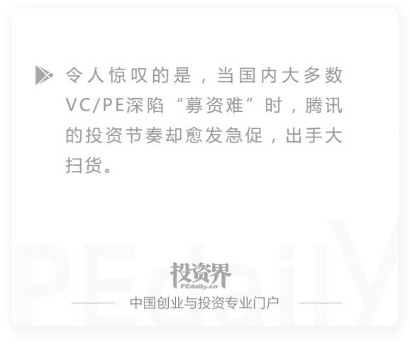 更令人惊叹的是,当国内大多数VC/PE深陷“募资难”时,腾讯的投资节奏却愈发急促,出手大扫货。