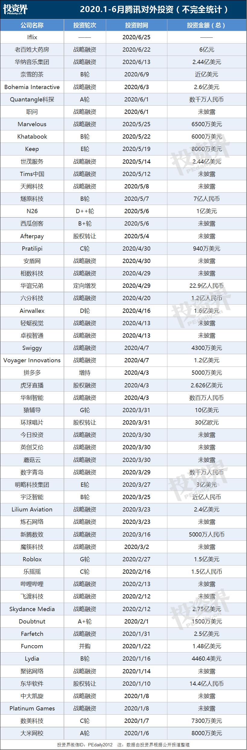 投资界(ID:pedaily2012)不完全统计,2020上半年,腾讯共对外公开了近60家投资案例,平均每3天投资1家公司,堪称上半年最活跃的投资机构。