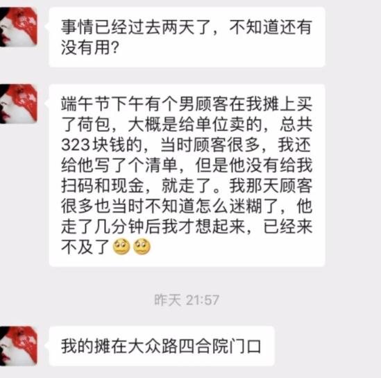 听众“雪在烧”:端午节下午大概两点左右,在大众路四合院小吃城门口的荷包摊上,一位年轻的男顾客给单位团购了323元的端午节香包,由于当时顾客很多,没有发现顾客未付钱就离开了。