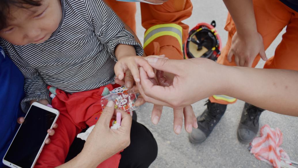 ◉ 7月2日,霍林郭勒市一4岁女童的手指被螺母卡住无法取下,孩子父母赶到霍林郭勒市消防队求助。只见一个厚度约有5毫米的螺母套在女童左手中指根部,手指已经严重肿胀。据女童父母介绍,螺母套在手指上已近2个小时。经过近30分钟的紧张施救,消防指战员成功将“咬”住女童手指的螺母取下。