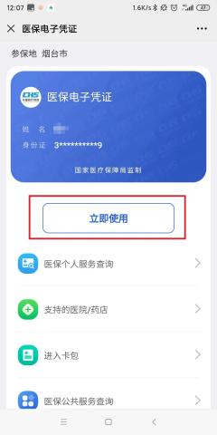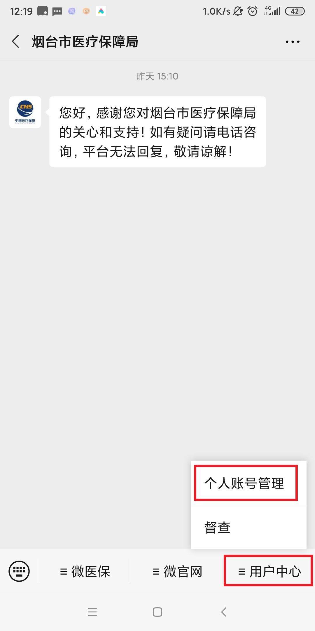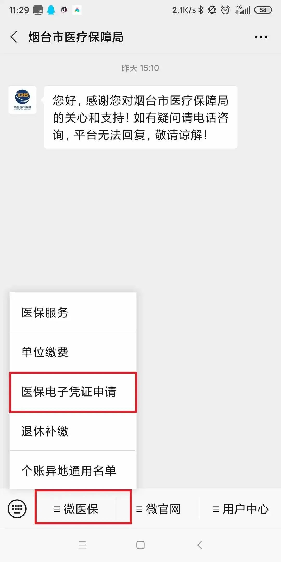 一、关注“烟台市医疗保障局”微信公众,点击“微医保——医保电子凭证申请”。