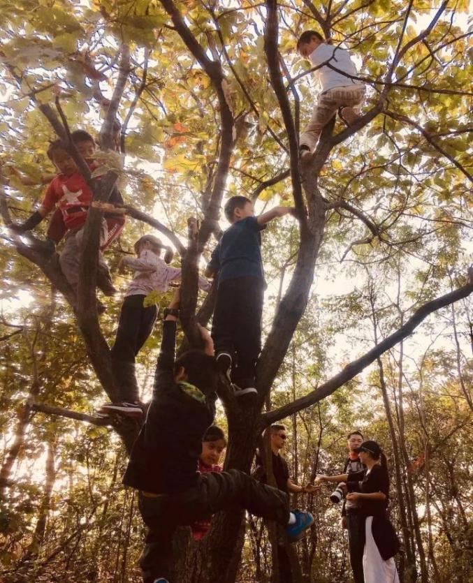 孩子们爬树,老师和家长不给予任何帮助,只是帮他们下来,在没有保护的情况下孩子们更懂得如何保护自己。(回想下,我们小时候到处爬树,好像也没怎么摔过)