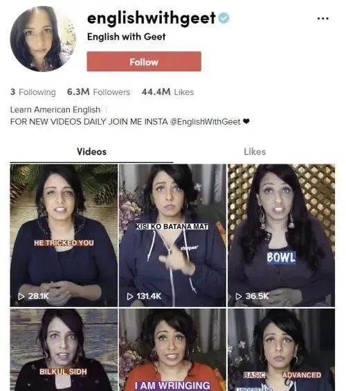 在印度出生、美国西雅图长大的吉特此前是一名律师,去年和父母回到新德里后,因在抖音教授“美式英语”一炮而红并成为全职视频博主。过去的一年,她每天都在“englishwithgeet”(跟吉特学英语)上传15个20秒左右的短视频,为饱受发音困扰的印度英语爱好者带去“美式”发音。此外她还有两个抖音号,为印度年轻人提供情感建议和正能量谈话,三个账号的粉丝加起来超过一千万。