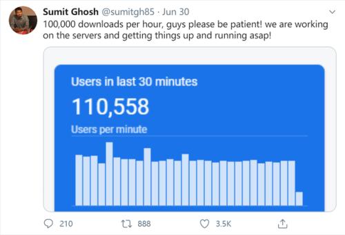 下载多了,服务器崩溃,30日,Chingari联合创始人兼首席产品官Sumit Ghosh在推特着急地喊话:“请大家耐心等待!我们正在调试服务器,会尽快启动并运行!”