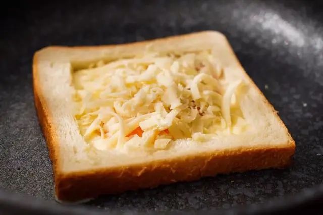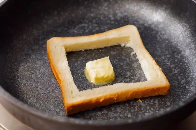 1、材料为一片面包,在中间挖出方形。然后将镂空的面包放入平底锅,在挖空处放入10g无盐黄油,小火慢慢加热。