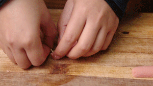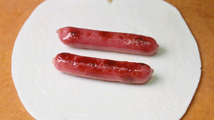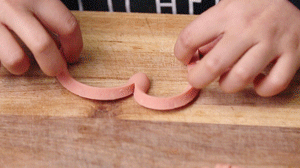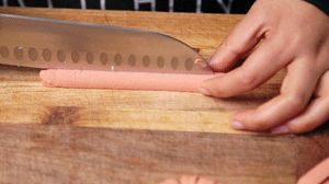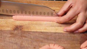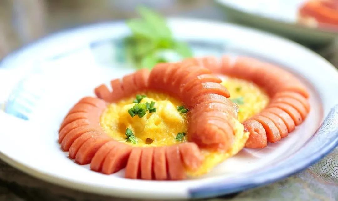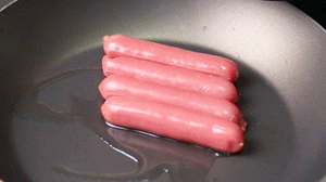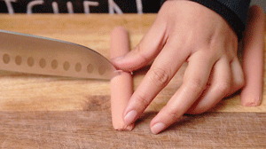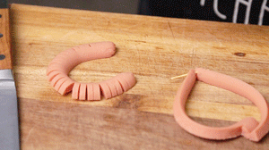 1、香肠对半切开,平面向下,再对半切开,不能完全切断。