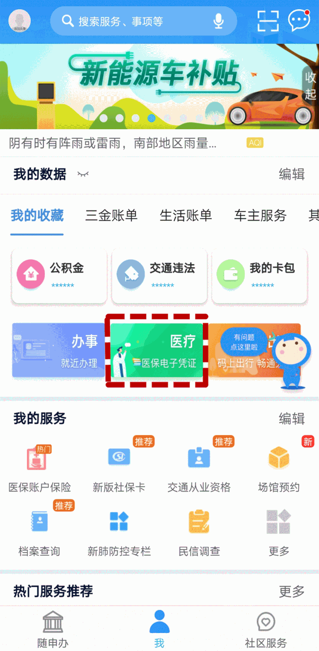 1、在随申办APP“我”的界面中,点击“医疗医保电子凭证”
