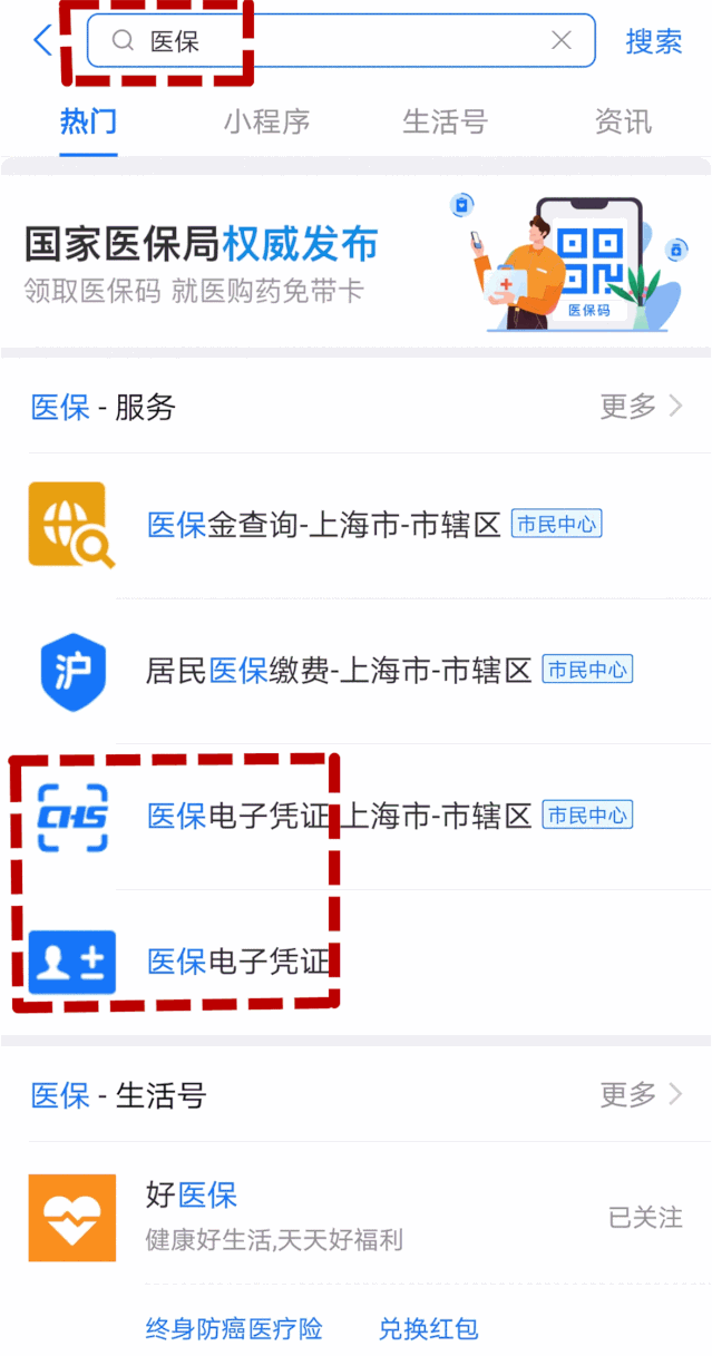 1、建议直接在支付宝首页搜索栏,搜索“医保”