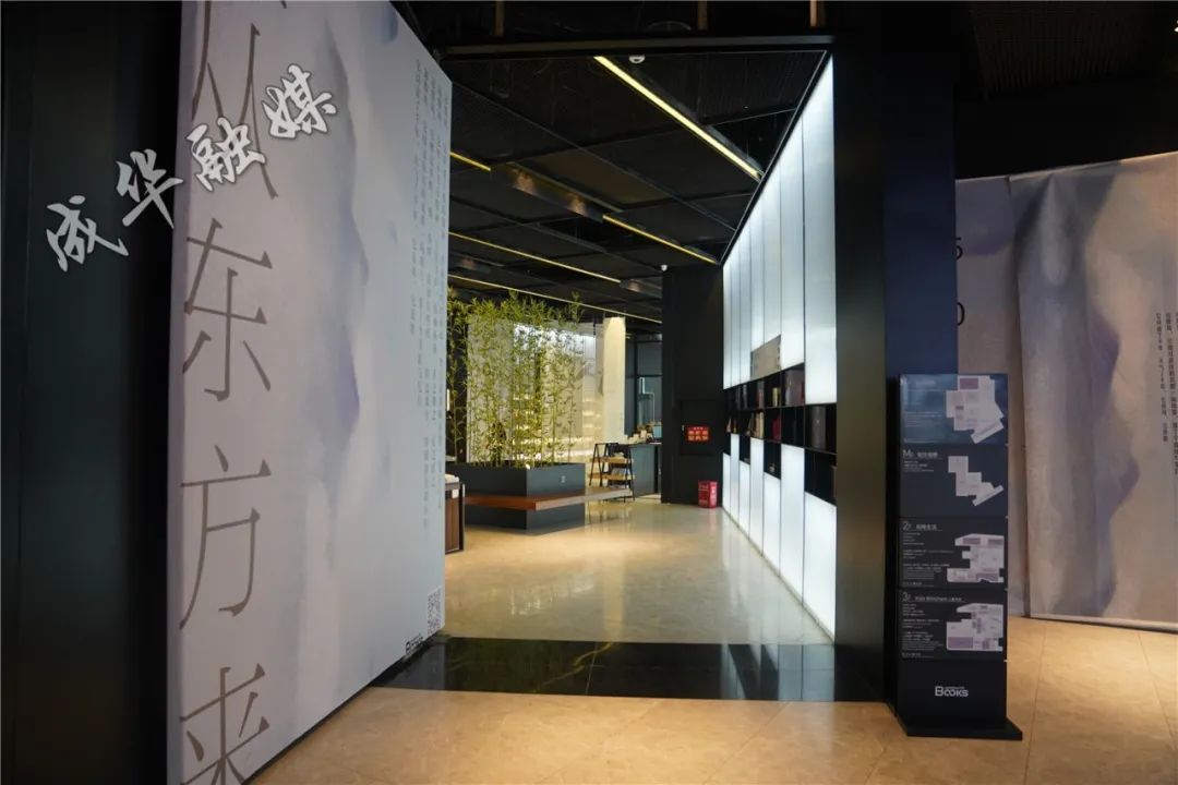 入门是策展厅,映入眼帘的是一张犹如客厅屏风且印着“烟火人间三千年”的大型立体纱物,其后能隐约看到“竹林几方”。