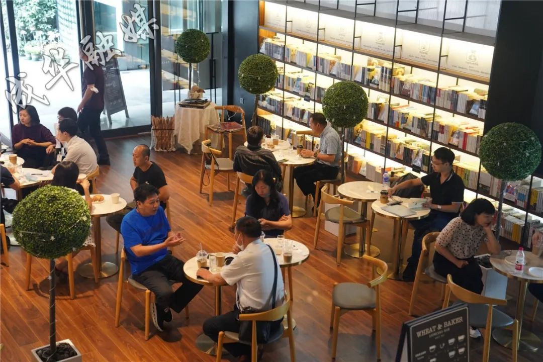 大厅的右侧书架中间,是一个2.5米左右高的透明玻璃橱窗,透过橱窗可以看到独立面包品牌WHEAT&BAKER。彼时,吧台内,一个戴着绿色围裙的姑娘正手捧着书,自在地漫走。