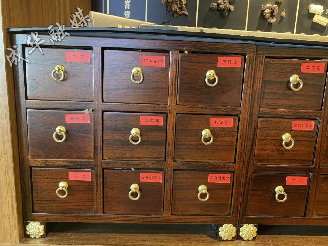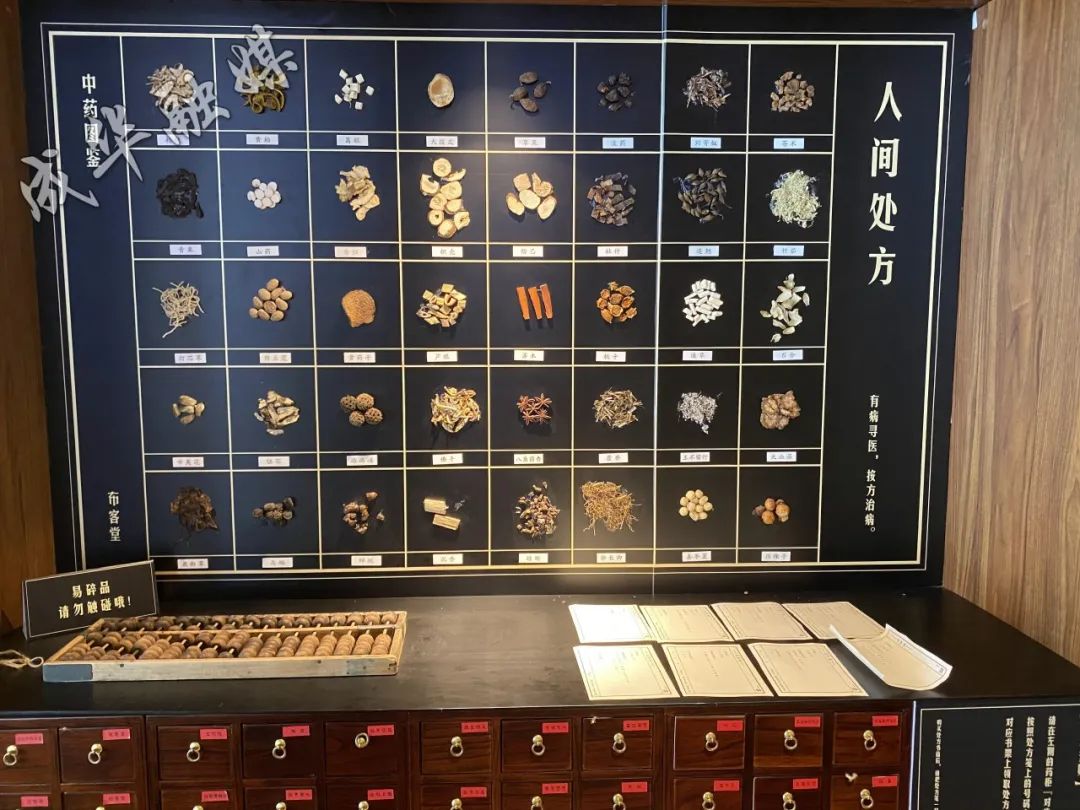 你看,从带铁环拉手的木质抽屉式药柜,到标本着灯芯草、辛夷花、乌梅等中药的图鉴,从被红蓝墨水浸染过、有明显岁月痕迹的实木算盘,到十字绑法的浅黄色药包……一幕幕景象仿佛在告诉我们,这,就是一个老药房。