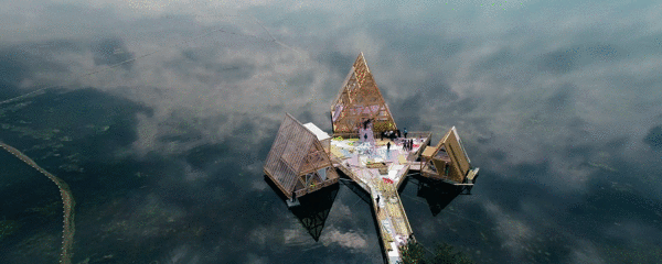 湖泊中间还有一个原木风的“金字塔”,