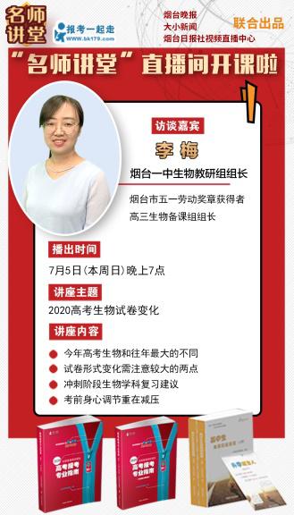 今晚7点,“名师讲堂”直播间特别邀请烟台市五一劳动奖章获得者、烟台一中生物教研组组长、高三生物备课组组长李梅老师,在这即将迈向考场的最后一刻,为考生和家长详解今年生物高考试卷的主要变化和应对策略,更为考生们能量输送,加油鼓劲!
